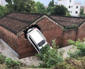 今天下午四点半左右,清远市区通往武广高铁的北江东路发生离奇车祸,一辆白色越野车突然冲出公路,将路下的村内祠堂撞出一个大洞。听到异常声响,附近很多村民都围上公路,俯瞰下面的事故现场,看到小车屁股撞破墙面的情形,纷纷感到不可思议。