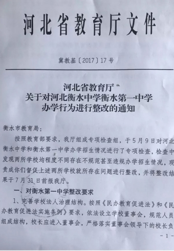 河北省教育厅6月1日印发了《河北省教育厅关于对河北衡水中学衡水第一中学办学行为进行整改的通知》。
