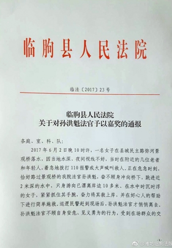 原标题:山东潍坊一女子夜间落水,过路法官跳水施救获奖2000元山东潍坊临朐县一女子夜间落水,过路法官跳进2米深水中,游向已漂离岸边10多米、在水中时沉时浮的女子,将女子成功救上岸。 临朐县人民法院政策