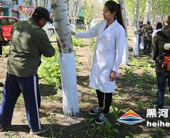 日前,市城管执法局园林科研所技术人员指导园林作业工人,对城区成年雌性杨树注射“抑花一号”,抑制杨树花芽形成,飞絮防治效果可达90%以上。