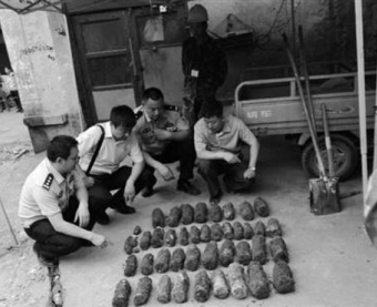 昨天下午,在济南市中区万紫巷的一个施工现场,工人挖下水道时竟然发现炸弹。随后,警方赶到现场,截止到昨天下午5点多,民警共挖掘出40枚炸弹。(警方供图) 昨天下午,记者赶到现场时,民警已经带着这些炸弹离开现场。