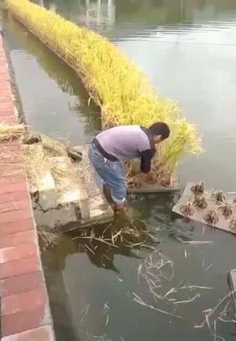 村民鱼塘水面上切割一条金“带子”,路人不解,走近一看纷纷点赞