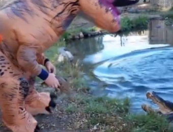 男子作死伪装成恐龙挑衅鳄鱼, 没想到几分钟过后, 结果变成了这样