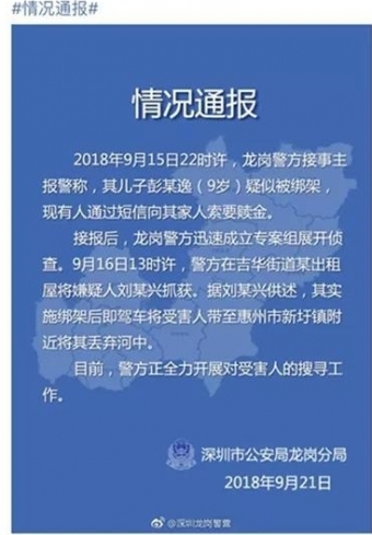 记者今日从深圳市龙岗区检察院获悉,检察机关已依法对犯罪嫌疑人刘某兴以涉嫌绑架罪批准逮捕。据刘某兴供述,其实施绑架后即驾车将被害人彭某逸(9岁)带至惠州市新圩镇附近并将其丢弃河中,目前,公安机关正全力开展对被害人的搜寻工作,案件正在进一步侦查