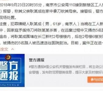 9月24日零点多,南京鼓楼警方通报:2018年9月23日20时35分,南京市公安局110接到鼓楼区工人新村耿某某(女)报警,称其父亲耿某成在家中拿刀砍其母亲。接警后,警方立即调集警力赶赴现场处置。