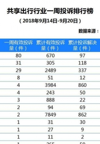 2018年9月14日至9月20日,21CN聚投诉共受理全国消费者对共享出行行业有效投诉量169件。涉及的商家有:ofo、哈罗单车、滴滴出行、Gofun出行、易到用车、首汽约车、酷骑单车、享骑电单车、小蓝单车、联动云租车、摩范出行、一嗨租车、首汽、摩拜单车、神州租车