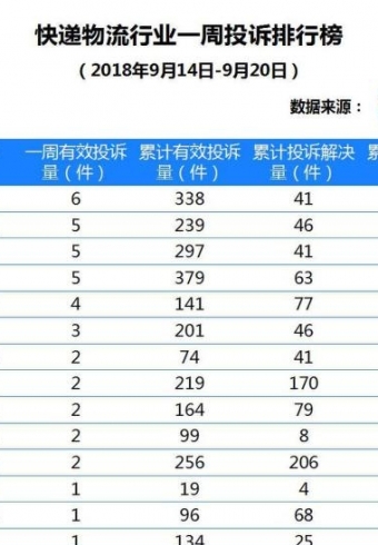 2018年9月14日至9月20日,21CN聚投诉共受理全国消费者对快递物流行业有效投诉量43件。涉及的商家有:圆通、百世快递、申通、顺丰、快狗打车、韵达、安能物流、货拉拉、天天快递、德邦物流、中通快递、芝麻开门、京东物流、EMS、闪送、优速快递查看21CN聚投诉