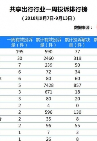 2018年9月7日至9月13日,21CN聚投诉共受理全国消费者对共享出行行业有效投诉量267件。涉及的商家有:ofo、滴滴出行、首汽约车、哈罗单车、享骑电单车、小蓝单车、酷骑单车、神州租车、拜客单车、易到用车、Gofun出行、摩拜单车、嘀嗒出行、摩范出行、一嗨租车
