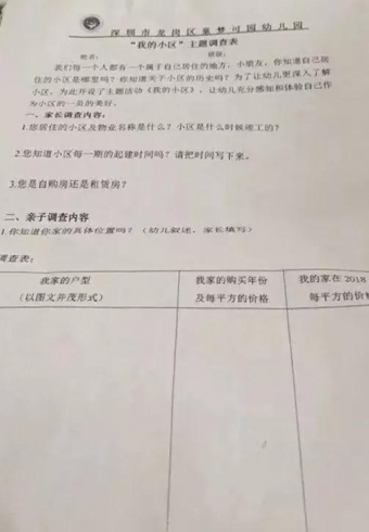 学校对孩子家庭情况的“调查”有无边界?日前一则新闻挑起了舆论的敏感神经,也“间接”回应了这个问题。据了解,深圳一幼儿园下发的《“我的小区”主题调查表》,引起了一些家长的不满和担心。微博@深圳龙岗教育最新表示:“我局已第一时间要求园方立即中止