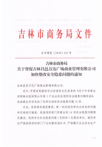 吉林市商务局关于督促吉林昌邑万达广场商业管理有限公司加快整改安全隐患问题的通知