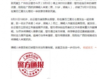 原标题:广州白云警方通报江夏北七巷命案:涉杀妻男子逃跑9天后被抓