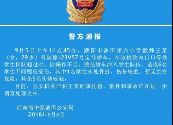 9月5日上午11点45分,在濮阳市油田第六小学校园内,教师王某(女,29岁)驾驶豫J23V57号宝马轿车,在该校院内门口等候学生排队通过时,因操作不当,导致轿车失控冲入学生队伍......