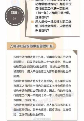 看看你的钱袋子 【人社部:试用期内也要给员工缴社保】试用期内,单位应该为员工缴纳社保吗?人社部表示,试用期内,用人单位也应当为劳动者缴纳社保费。用人单位应该自用工之日起30日内为其职工向社会保险经办机构申请办理社会保险登记。有的单位自行规定工