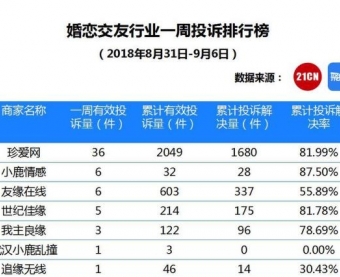 2018年8月31日至9月6日,21CN聚投诉共受理全国消费者对婚恋交友行业有效投诉量60件。涉及的商家有:珍爱网、小鹿情感、友缘在线、世纪佳缘、我主良缘、武汉小鹿乱撞、追缘无线、一诺情感、百合网查看21CN聚投诉投诉排行榜全部内容:http://ts.21cn.com/mercha