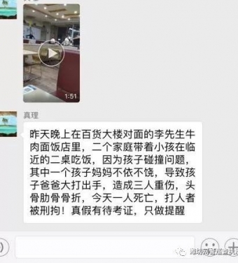 近期,一段“潍坊百货大楼对面的牛肉面饭店里打架”视频传遍了朋友圈,内容是两个家庭因为纠纷大打出手,甚至闹出了人命,引发网民的大量转发和关注。