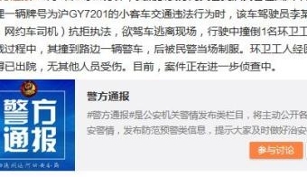 中新网客户端9月4日电 今日,上海市公安局黄浦分局官方微博发布通报称,民警在处理一辆小客车交通违法行为时,驾驶员抗拒执法,撞倒1名环卫工人并撞到路边一辆警车,后被制服。