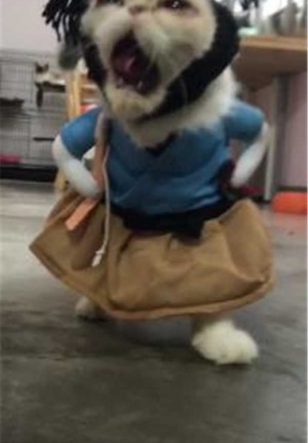 一名猫奴特地买了一套武士装,套在自家“主子”身上后,瞧它摆臭脸再加驼背走路的样子,好像超级不情愿。