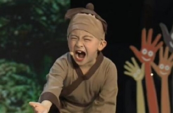 “张二娃欢喜昏了,一手提鸡,一手拿撑花,埋头就走……”6岁男孩冉若楠声音尚显稚嫩,举手投足倒颇具戏剧性,加上喜感十足的夸张的表情,逗得台下观众捧腹大笑。