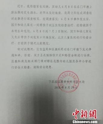 中新网张家口8月30日电 (张帆 郝烨)近日,一则视频在网络流传:河北省张家口市下花园区某早教机构,一名不足三岁的幼儿在上游泳课时溺水长达两分钟,游泳老师并未及时发现。8月29日,张家口市下花园区教育和科学技术局针对此事发布的通报称:经抢救孩子未有生