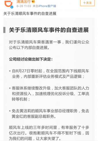 近日滴滴出行公布了《关于乐清顺风车事件的自查进展》,称将下线最近两次爆出“女乘客被奸杀”恶劣事件的顺风车业务,并罢免两位高官的职务,以挽回公众信心: