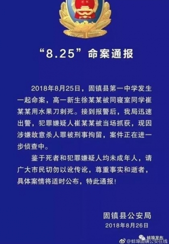 2018年8月25日,固镇县第一中学发生一起命案,高一新生徐某某被同寝室同学崔某某用水果刀刺死。接到报警后,我局迅速出警,犯罪嫌疑人崔某某被当场抓获,现因涉嫌故意杀人罪被刑事拘留,案件正在进一步侦查中。