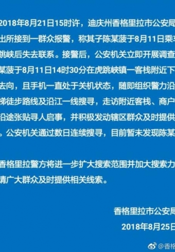 云南省迪庆藏族自治州香格里拉县公安局官方微博 @香格里拉警方8月26日消息,关于一男子在虎跳峡失联的情况通报: