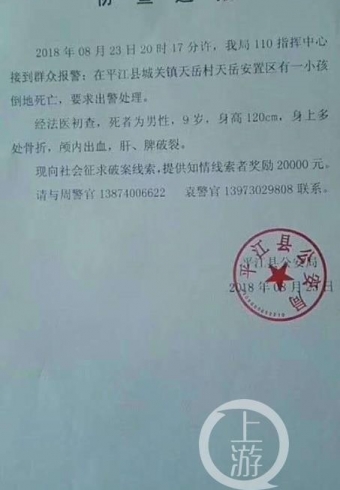 8月23日,湖南平江县一9岁男孩蹊跷死亡,经鉴定:其全身多处骨折、颅内出血、肝、脾破裂。