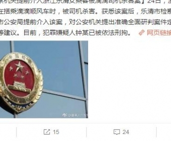 中新网8月25日电 据最高人民检察院微博消息:24日,浙江乐清乘客赵女士在搭乘滴滴顺风车时,被司机杀害。获悉该案后,乐清市检察院第一时间赴乐清市公安局提前介入该案,对公安机关提出准确全面研判案件定性、依法规范取证等建议。