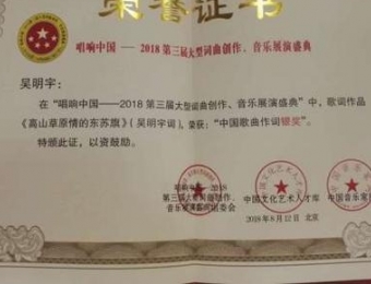 商报讯(记者 刘约)刚从北京回来的文学艺术爱好者吴宇明在“唱响中国——2018 第三届大型词曲创作、音乐展演盛典”中,以歌词作品《高山草原情的东苏旗》荣获“中国 歌曲作词银奖”。