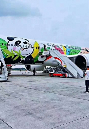 8月22日02:00,川航3U8892从北京飞往成都的A350飞机因成都天气原因,成功备降银川河东国际机场,身披熊猫彩绘妆的“熊猫墨镜侠”乘夜色带着紧张“第一次”降落银川河东国际机场。这是银川机场接待的首架“幸运儿”,对于所有的工作人员都是一种挑战。