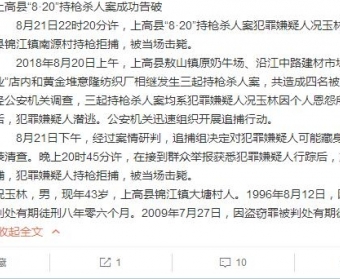 中新网8月22日电 据江西省宜春市上高县委宣传部官方微博“上高发布”消息:江西省宜春市上高县“8.20”持枪杀人案成功告破。犯下三起持枪杀人案,造成四名被害人身亡的犯罪嫌疑人况玉林于8月21日晚在上高县锦江镇南源村持枪拒捕,被当场击毙。