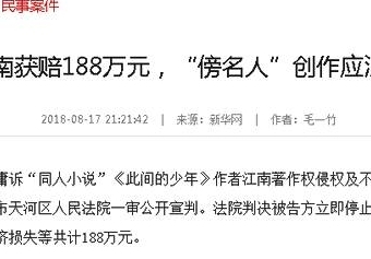 著名作家金庸诉“同人小说”《此间的少年》作者江南著作权侵权及不正当竞争纠纷一案,16日在广州市天河区人民法院一审公开宣判。法院判决被告方立即停止不正当竞争行为,赔偿金庸经济损失等共计188万元。
