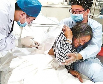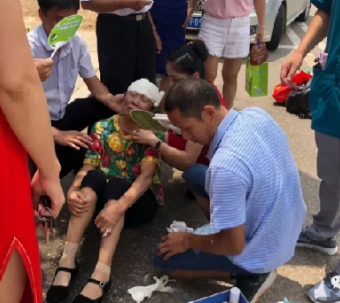 老人身边,一名身穿蓝衣的男子半蹲在路边,指挥另一名白衣男子把受伤的老奶奶抬在路边。接着,他拿起急救箱迅速进行救援。
