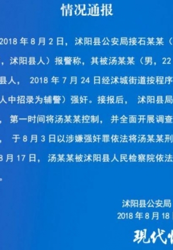 现代快报8月18日消息,日前,宿迁市一位派出所的辅警利用自己的身份强奸报警人的事情引发了许多网友的关注。现代快报记者了解到,8月18日中午,当地警方针对此事发布情况通报,表示这名辅警已经被检察机关依法批准逮捕。