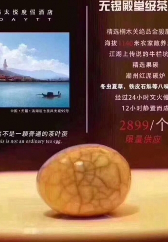 【茶叶蛋2899元】据北京青年报报道 这不是一颗普通的茶叶蛋!它是由多种高贵食材,经过24小时文火慢煨,12小时静置而成的——茶叶蛋,每颗售价2899元。8月17日,无锡太悦度假酒店向记者表示,该茶叶蛋系酒店自产自销,因用料考究而价格昂贵,限量100颗已售罄