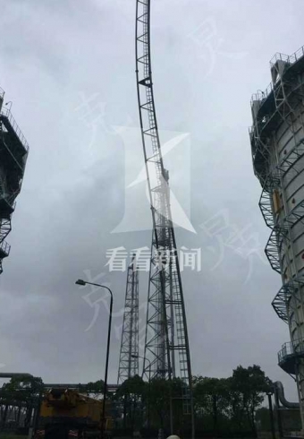 受到台风影响,8月17日清晨6点多,高桥石化厂区内一根42米高的灯塔发生倾斜,施工人员随即展开拆除工作。