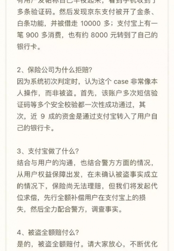 豆瓣网友“独钓寒江雪”遭遇离奇的盗窃,7月30日凌晨5点多醒来后发现手机一直在震,接收了来自支付宝、京东、银行等的100多条验证码,然后发现“支付宝、余额宝、余额和关联银行卡的钱都被转走了。京东开了金条、白条功能,借走一万多”。又遇到保险拒赔,瞬