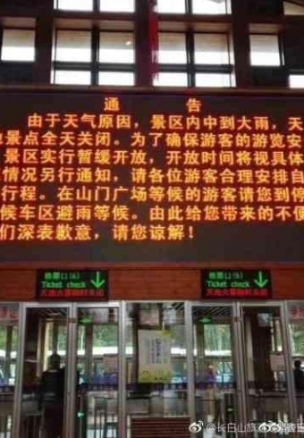 【因持续大到暴雨 长白山景区今日全天关闭】据@长白山发布 由于天气原因,长白山景区大雨,景区全天关闭,为了确保游客的游览安全,请游客合理安排自己的时间!