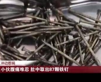 华西都市报8月13日消息。8月8日晚,湖南郴州一小伙腹部剧痛难忍,紧急就医。医生从小伙的腹腔和胃部等取出87根铁钉,每根长度约5厘米。原来小伙最近刚交了一个女朋友,因两人吵架女孩要分手,小伙一时想不开就吞下了87根铁钉和7颗图钉。现小伙已经脱离生命危