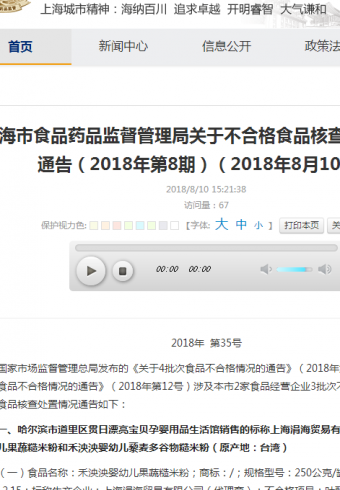 上海市食药监局发布:关于不合格食品核查处置情况的通告(2018年第8期)(2018年8月10日)