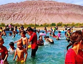 一面是热气蒸腾、烟云缭绕的火焰山,另一面是占地近3000平方米、满池碧波荡漾的露天游泳馆,就在这两处让人有强烈视觉反差冲击的景致间,又是一片绿意盈盈的杏花林将两者连作一处,生出一片凉意。