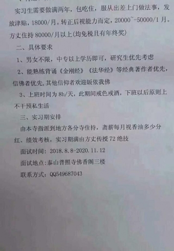 8月10日,泰安人朋友圈里忽然出现这么一条信息:泰山普照寺招聘和尚,并附上了待遇、补贴、具体要求、实习期安排等。很多网友问,这是真的吗?齐鲁晚报泰安融媒记者咨询景区工作人员得知,该信息为假,大家切勿上当受骗。