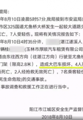 广东一双层大巴冲限高杆被“削头”,致4人死亡7人受伤