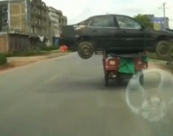 央视网消息:近日,在广西玉林市博白县东平镇发生了惊险的一幕,一辆三轮摩托车竟“驮”着汽车在路上行驶。