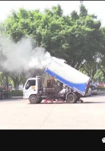 今天上午十点半左右,市民经过梅城江南嘉应大桥附近时,看到前面一辆环卫车不知为何冒出白烟,难不成是炎热天气干活“中暑”了吗?