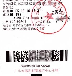 7月29日,双色球第2018087期开奖,红球号码01、05、10、16、18、31,蓝球号码03。当期广东中出10注二等奖,每注奖金38万多元,其中4注花落江门市开平祥龙中路44122478投注站,总奖金152万多元。经检索,该4注二等奖由一名彩民独得,中奖彩票是一张投注金额为8