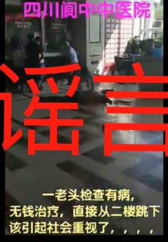 人民网讯 近日,一段男子在医院内跳楼的视频在四川阆中等多地热传,有的视频上还带有文字标注“望请转发,中医院一老头检查有病,无钱治疗,直接从二楼跳下该引起社会重视”。该视频经广泛传播后引发热议,随后阆中中医院及多地网警对此进行了辟谣。经核查,
