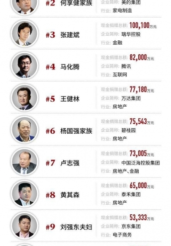 近日,福布斯公布了 2018 中国慈善榜,共 100 位企业家上榜,恒大集团董事长许家印以 42.1 亿元的现金捐赠总额居于首位,美的集团创始人何享健家族、瑞华控股董事长张建斌分别以 10.9 亿元和 10 亿元的现金捐赠总额位列第二和第三;而我们熟知的腾讯公司控股