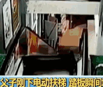 近日,安徽宁国一家超市的自动扶梯运行中突然发生故障。监控显示,7月28日晚,一对父子刚走下扶梯不到2秒钟,身后的扶梯梯级踏板就突然翻滚叠加,发生塌陷。