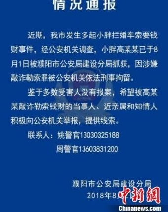 中新网濮阳8月2日电(记者 刘鹏)记者2日从河南濮阳警方获悉,近期被媒体多次披露的濮阳“小胖拦婚车”事件中,当事人高某某因涉嫌敲诈勒索罪已被警方刑事拘留。警方呼吁受害者或知情人积极举报、提供线索。